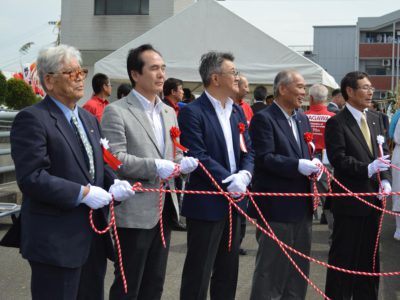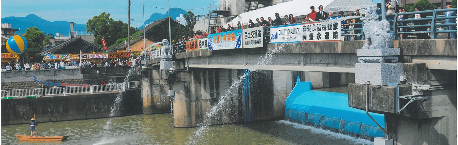 彦山川にかかる新橋横の管理橋に風治八幡宮の狛犬をイメージした2基のモニュメント。川渡り神幸祭の時はもちろん、1年を通じて河川環境美化のシンボルとして新たな田川の観光名所になるように祈念して田川市に寄贈しました。