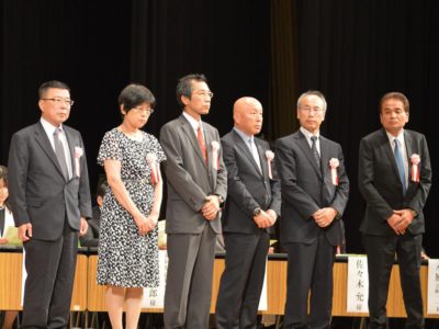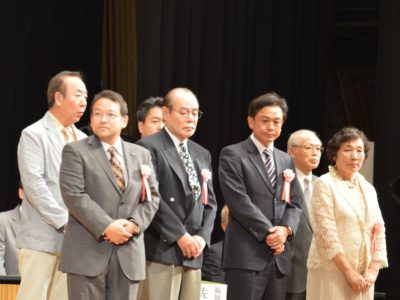 第1部の記念式典では創業70年以上の37事業所を表彰。長きにわたって事業を継続し、地域に貢献してこられた会員事業所の労をねぎらいました。また5月の風治八幡宮川渡り神幸祭の際に設置した記念モニュメントの贈呈式が行われました。