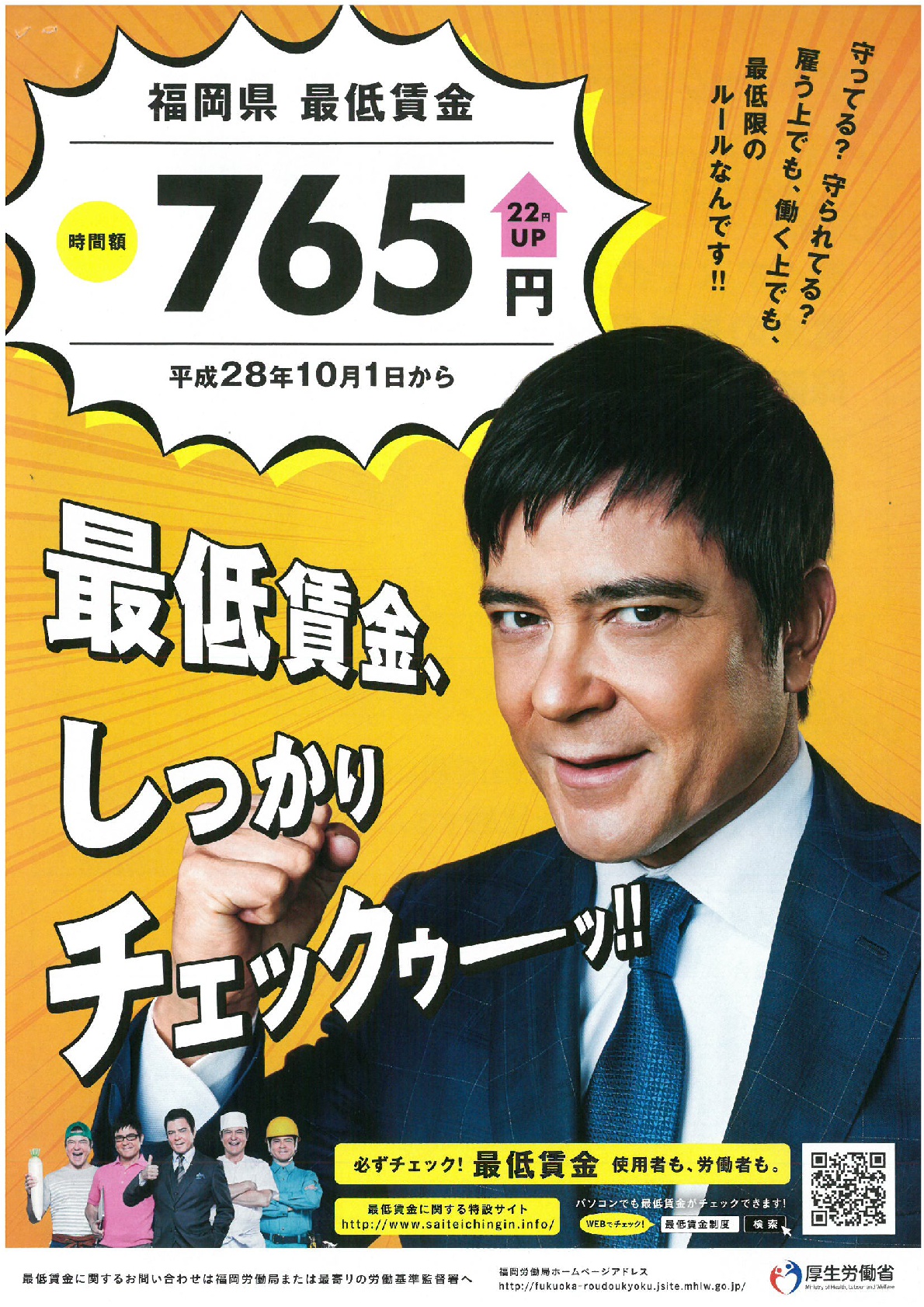 福岡県最低賃金が次のとおり改正されます。 1時間 765円 (効力発生効力日 平成28年10月1日) ~必ずチェック最低賃金 使用者も、労働者も。~ 詳しくはこちら