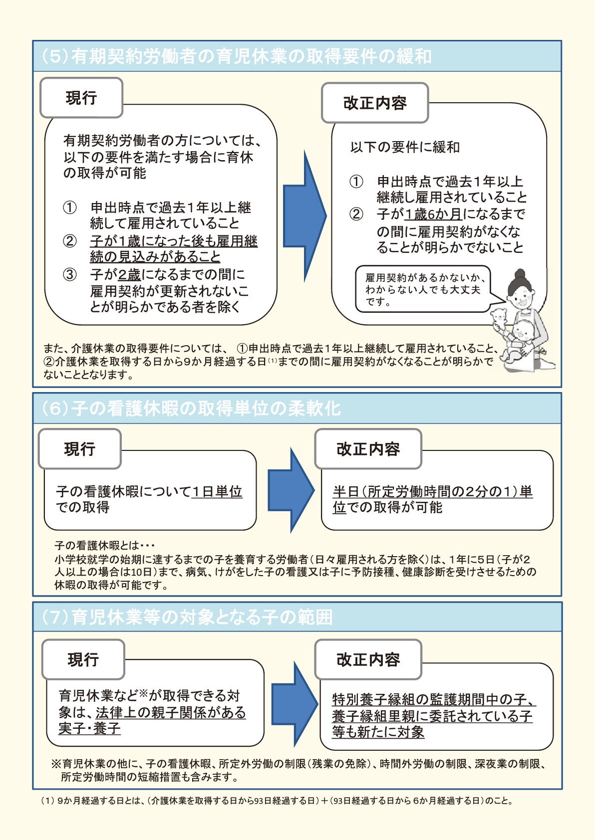 介護をする方や、有期契約労働者が介護休業・育児休業を取得しやすくなるよう改正を行いました。 詳細については厚生労働省ホームページをご覧ください。