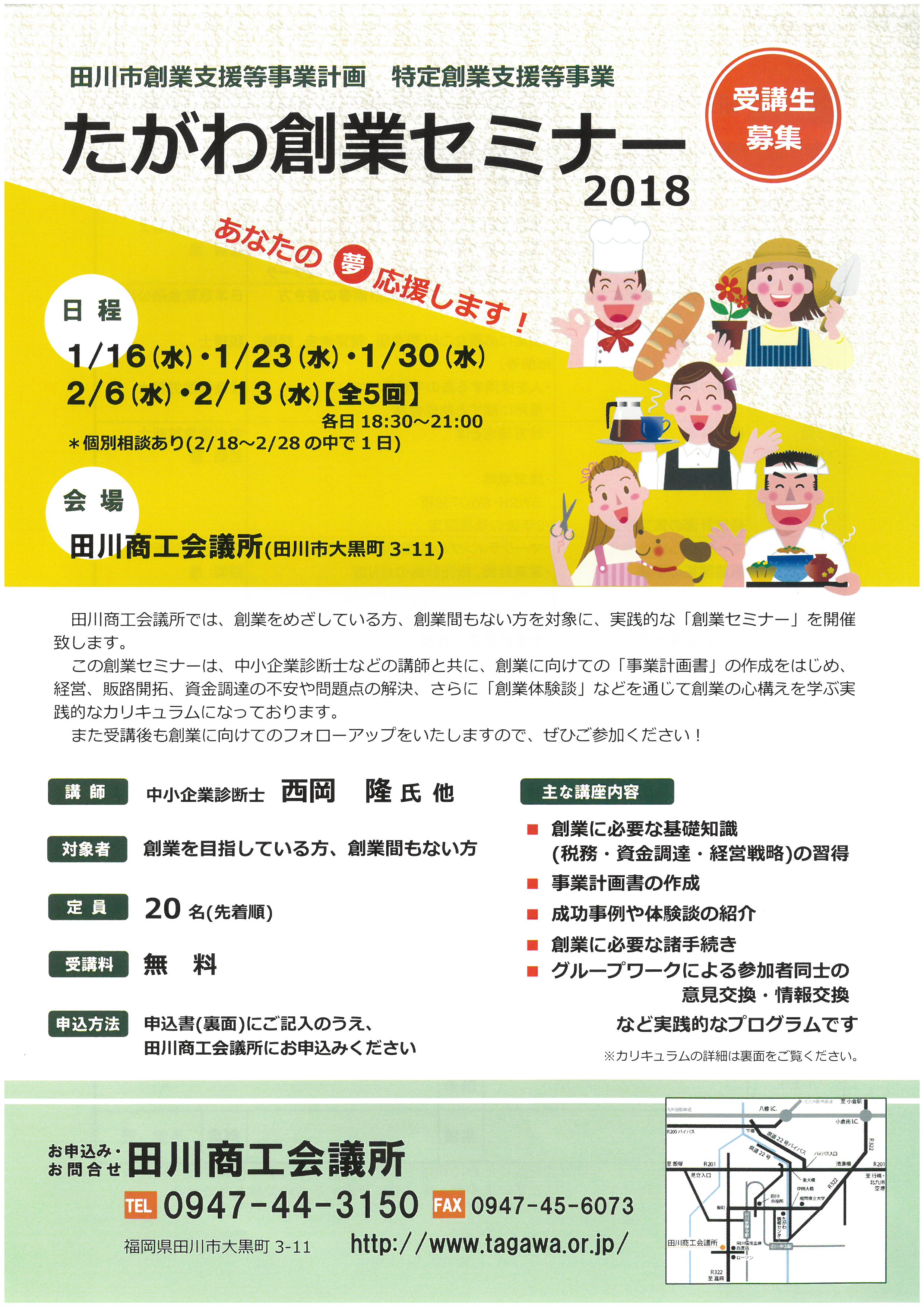 田川商工会議所では、創業をめざしている方、創業間もない方を対象に、実践的な「創業セミナー」を開催致します。