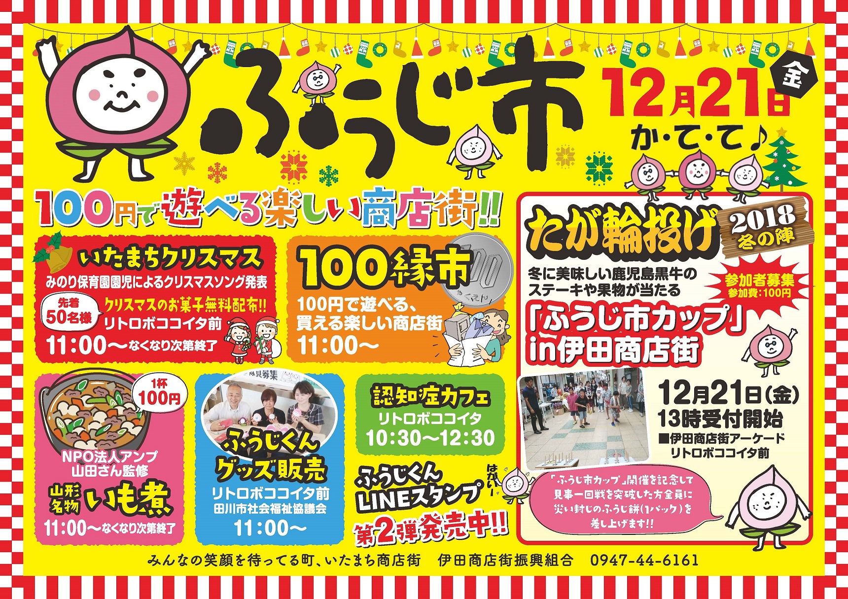 風治八幡宮境内に祀られている塞神社(さいじんじゃ)、武内宿禰(たけのうちすくね)といった神々にお参りすることで、私たちの抱えている多くの悩み、災いを封じていただけます。「ぼけ封じ」「病い封じ」「浮気封じ」「ギャンブル封じ」など全国的に見ても封じる神社はわずかだと思われます。伊田町商店街では、御参詣の皆様をあつくおもてなしするために、平成25年より「ふうじ市」を開催しています。 次回の開催は12月21日(金)です!