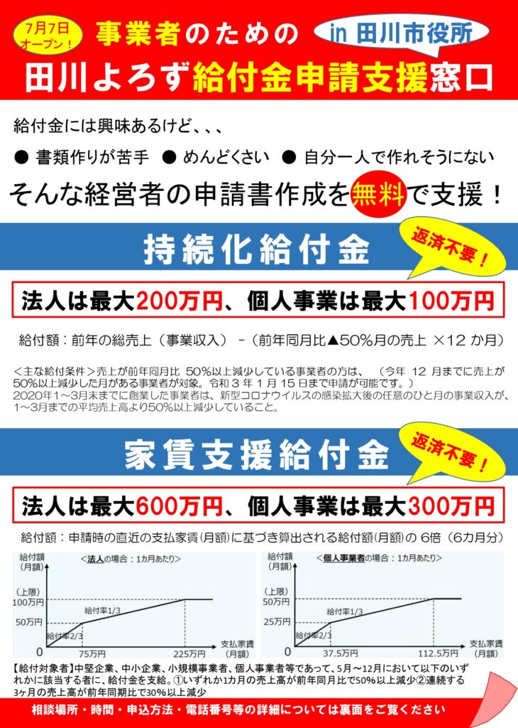 「事業者のための田川よろず給付金申請支援窓口」を開設します。