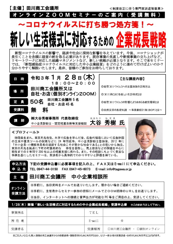 ※当初、たがわ情報センターで対面のセミナーを予定しておりましたが、福岡県が新型コロナウィルス感染拡大に伴う国の緊急事態宣言の対象区域に加えられたことにより、田川商工会議所にて受講(定員5名)、オンラインにて受講(定員45名)の開催へと変更になりました。