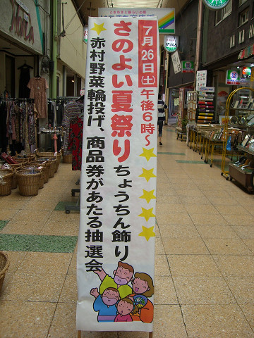 今日は土用丑の日 スタミナをつけて今年の夏も元気に乗り切りたいところです 本日、伊田商店街を歩いていますと立て看板を発見! あさって7月26日(土)の午後6時からさのよい夏祭りが開催される様子 アーケードを見上げると赤いちょうちんがいくつも飾ってありました 商品券が当たる抽選会もあるようです週末は商店街へGO! (ピ)