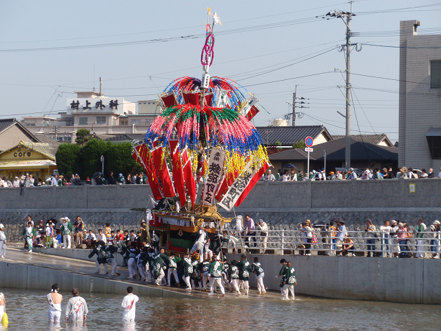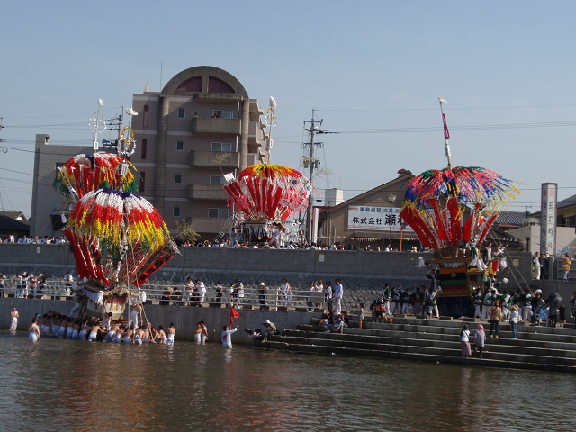 続いて、川渡り神事があり、山笠がどんどん川の中へ入っていきます・・・