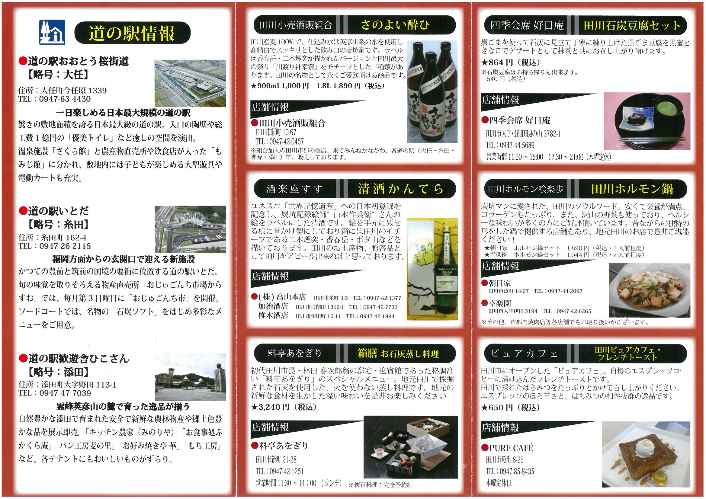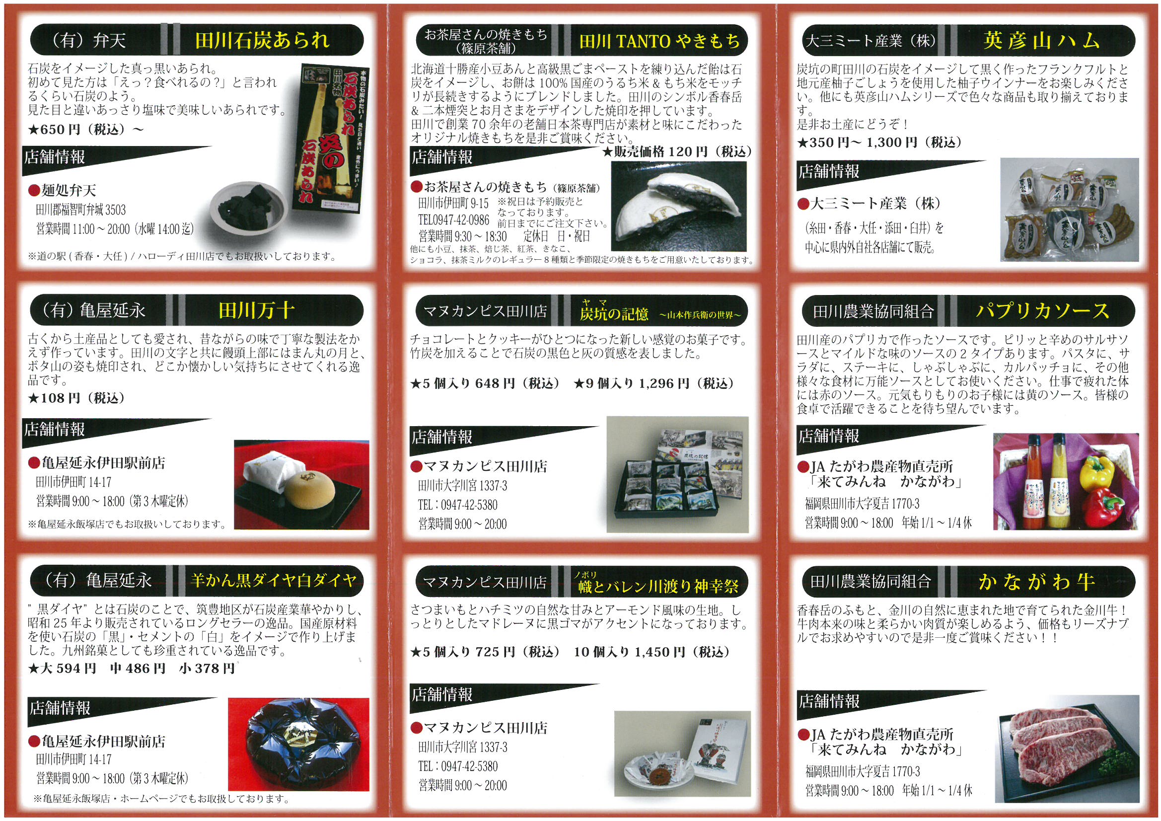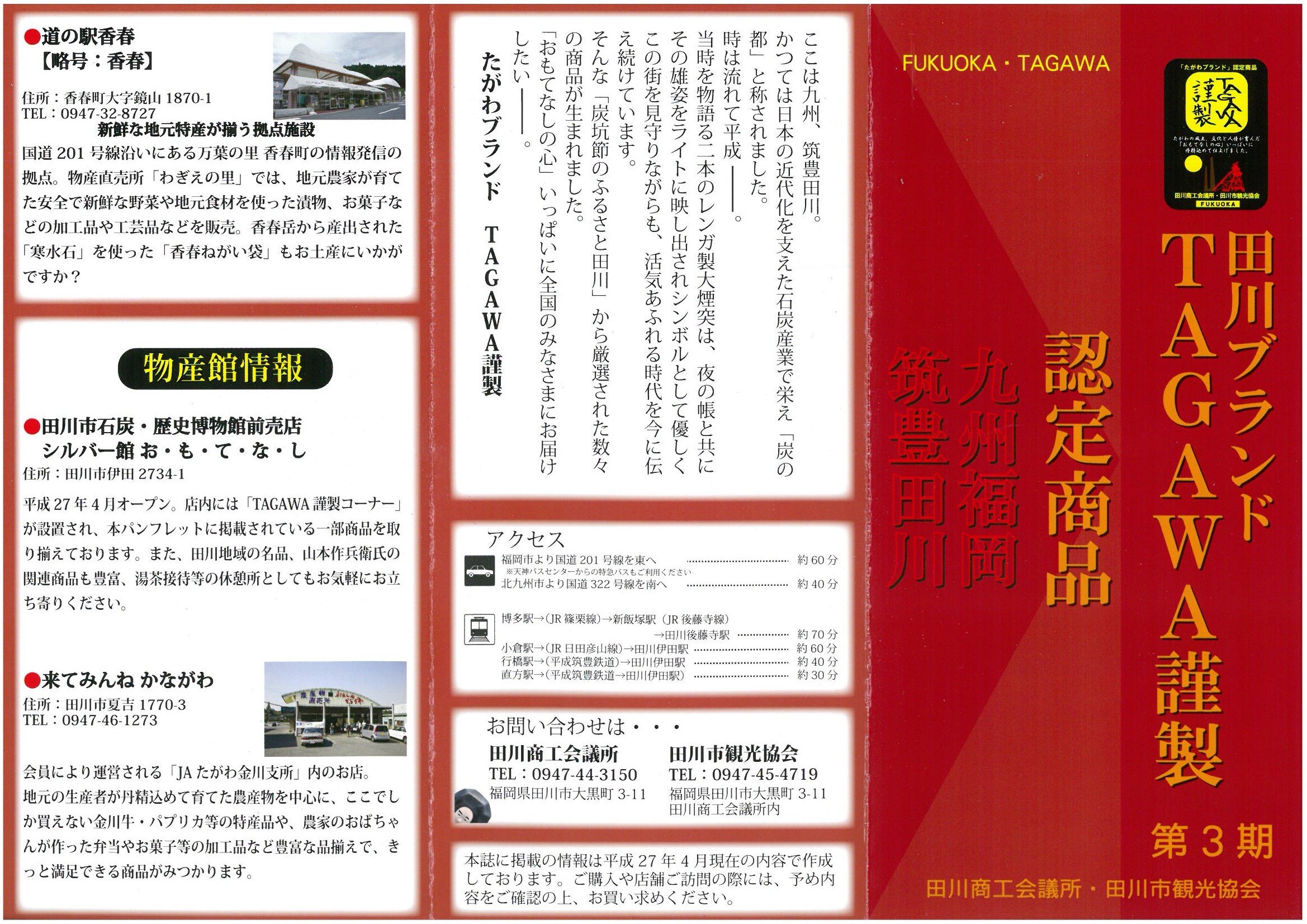 第3期!田川ブランドTAGAWA謹製商品が決定いたしました! TAGAWA謹製とは田川を代表する商品、 田川を広くPRできる田川商工会議所・田川市観光協会の公認する たがわブランド商品です!! 本日新しいパンフレットができあがりましたよ(๑˃̵ᴗ˂̵)و 全部で24商品が掲載されています★ パンフレットは田川商工会議所にも置いてあります。 どうぞご覧くださいね( ´ ᗨ ` ) (ピ)