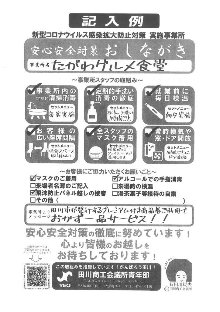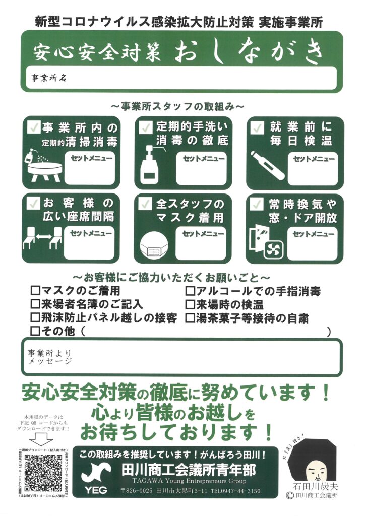 先日、田川商工会議所青年部がコロナ対策PRチラシ「安心安全対策おしながき」を作成しました!
