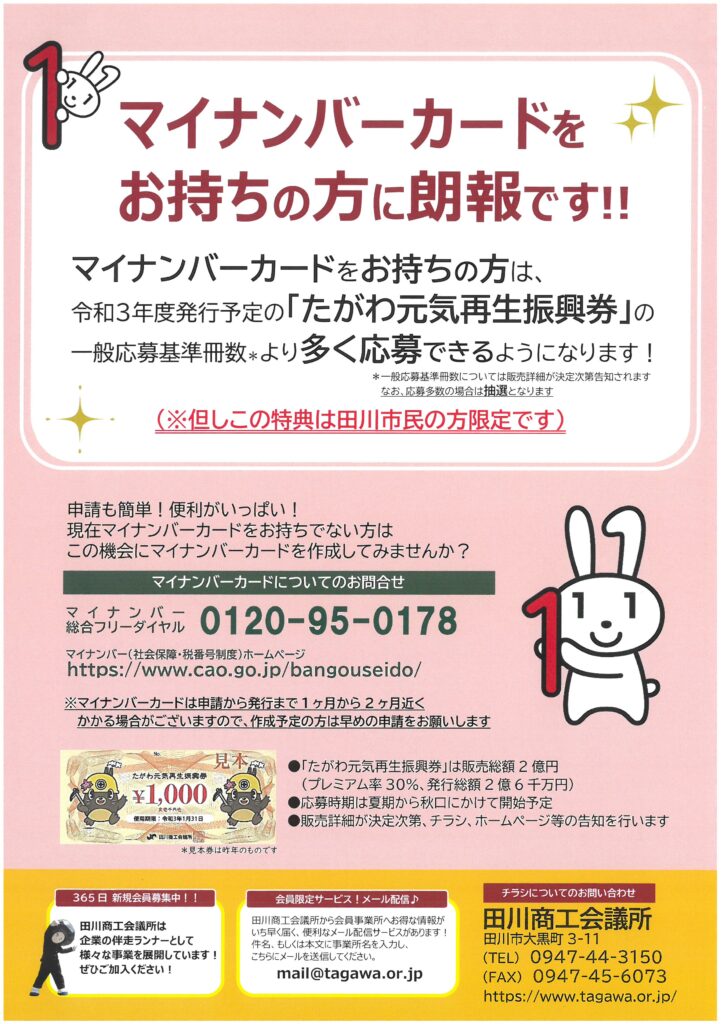 マイナンバーをお持ちの田川市民の方は5冊まで。