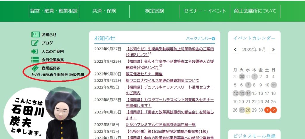 パソコンだと、石田川炭夫くんの頭の上ぐらいに『商業振興券 たがわ元気再生振興券 取扱店舗』とあるので、クリックすると一覧表が表示されます。