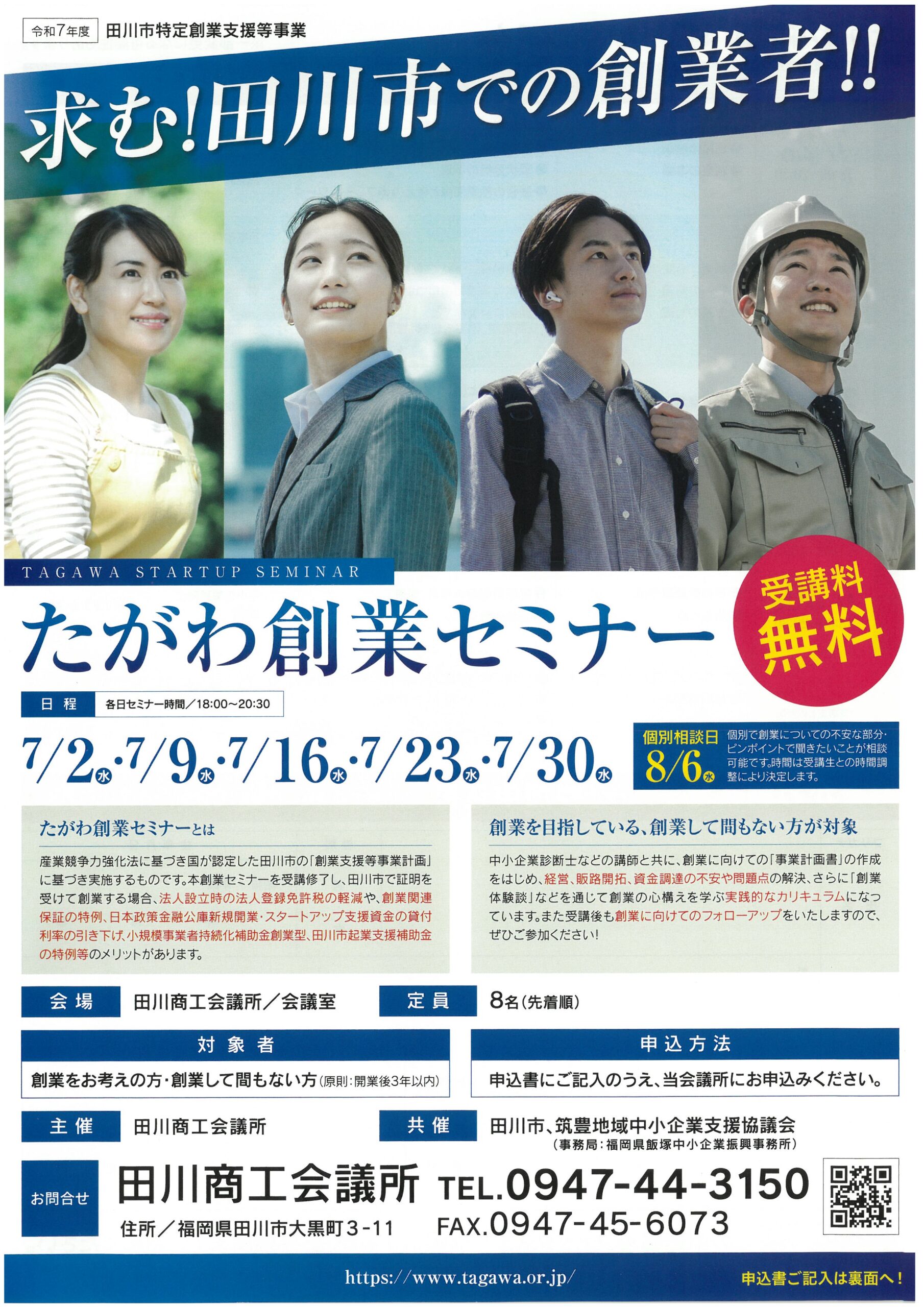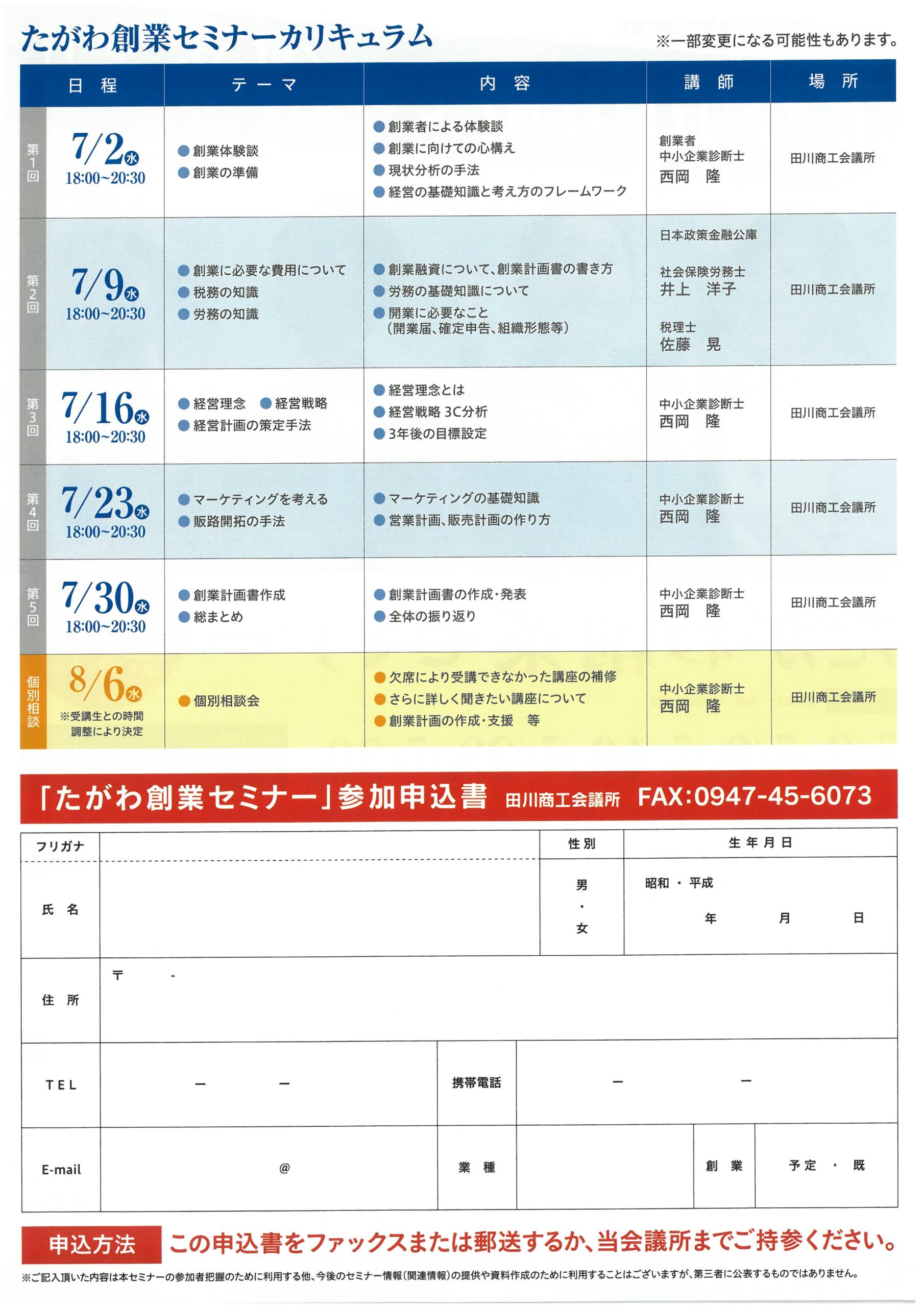 受講ご希望の方は、参加申込書に記入の上、FAX(0947-45-6073)もしくは、郵送(〒826-0025 田川市大黒町3-11)または、ご持参ください。