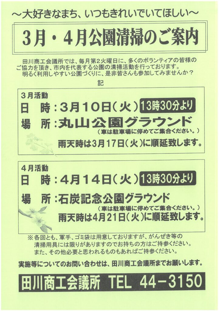 お花見シーズンに向けて、今月に引き続き、丸山公園の清掃活動となります。