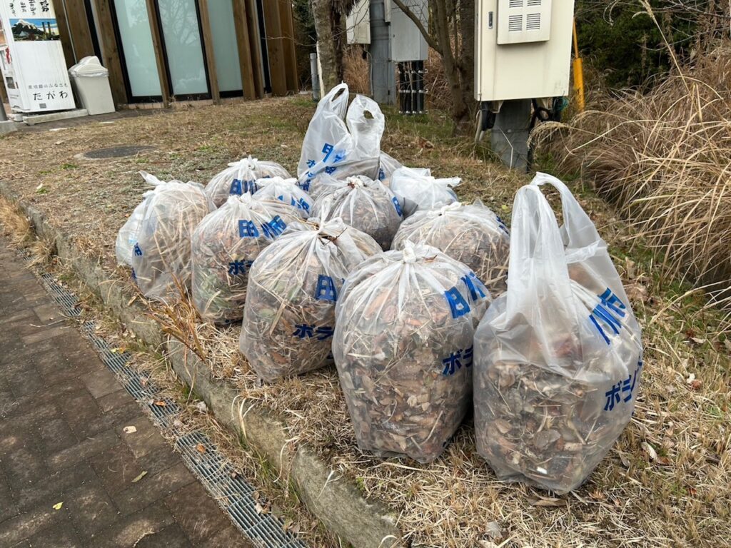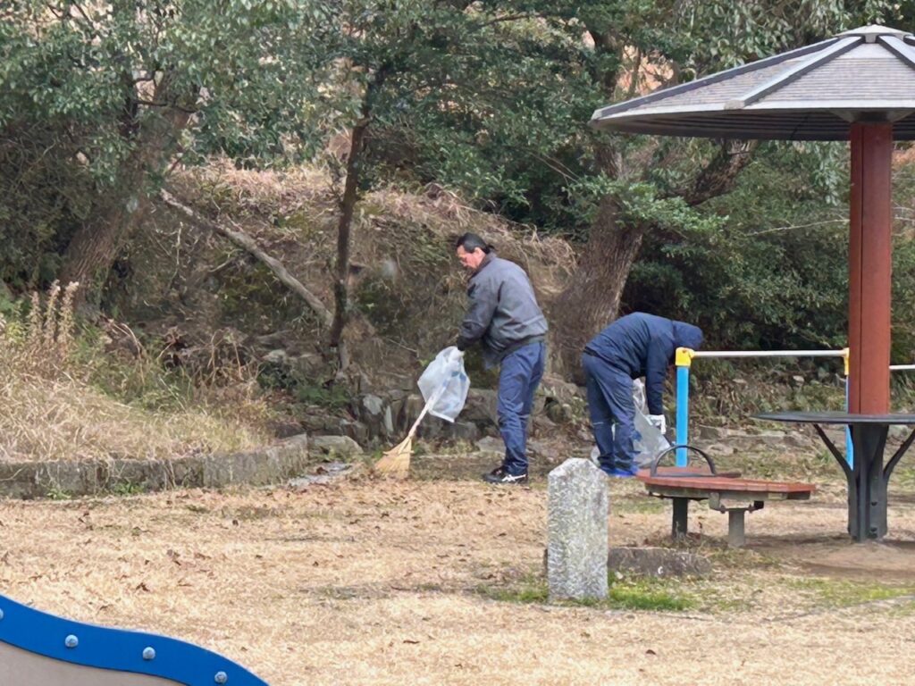 今回は、天候に恵まれず・・・(߹𖥦߹) 小雨がパラつく中、遊具・トイレ周辺を中心に落ち葉の回収を約30分ほど行いました。