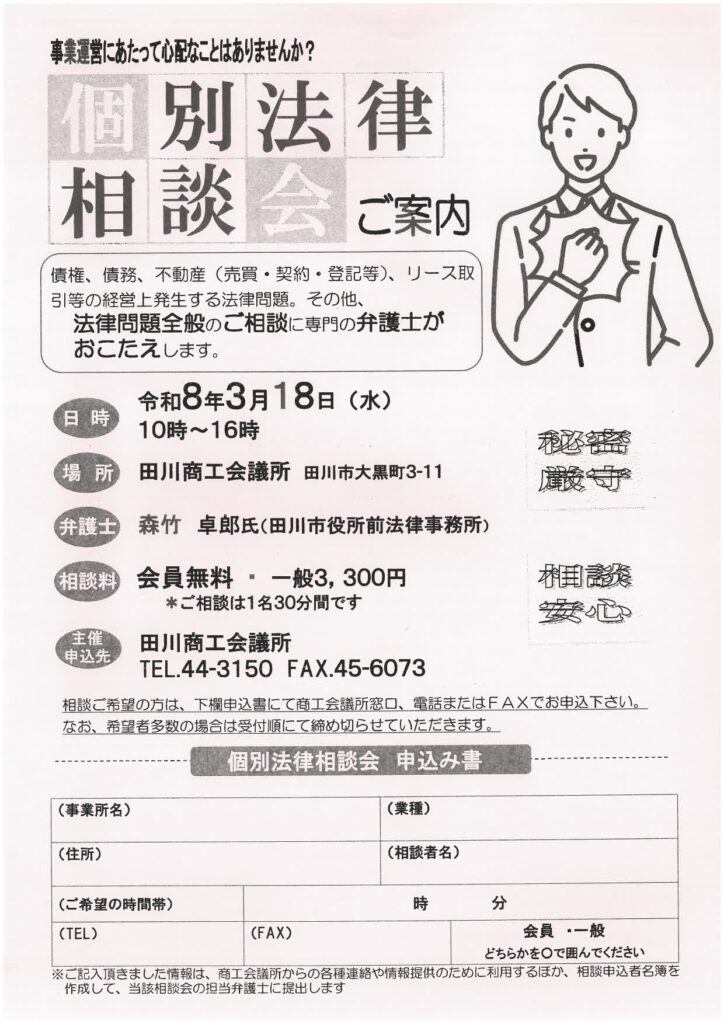 3月18日(水)当所にて『個別法律相談会』が開催されます。